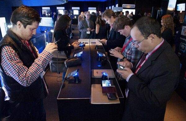 Attendees view the BlackBerry Ltd. Passport smartphone during a product announcement in Toronto, Ontario, Canada, on Wednesday, Sept. 24, 2014.Hannah Yoon/Bloomberg