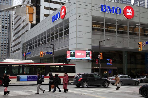 Pedestrians walk past offices for the Bank of Montreal in Toronto.