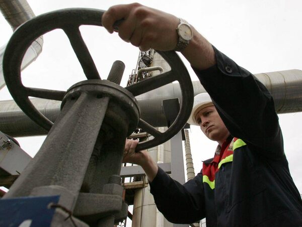 A worker turns a valve at the Rosneft oil refinery in Tuapse at the Russian Black Sea coast September 6, 2006.SERGEI KARPUKHIN/Reuters