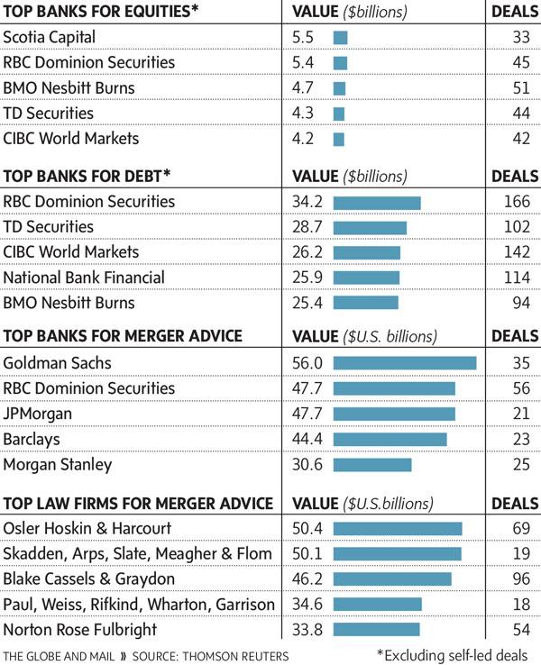Goldman Sachs & Co. lead the pack, advising clients on 35 deals worth $56-billion. That included a role in the second-largest acquisition of the year, when Talisman Energy Inc. was bought by Spain's Repsol SA for $12.8-billion, including net debt, in December. RBC Capital Markets were the runners up in the M&A table, with $47.7-billion worth of acquisitions.