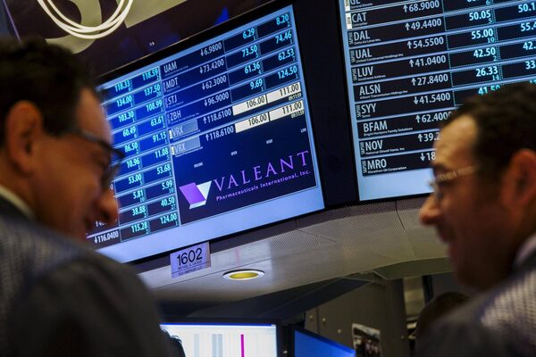 Traders work on the floor of the New York Stock Exchange underneath a board showing the name of Valeant Pharmaceuticals shortly before the opening of the markets in New York on Oct. 22, 2015.LUCAS JACKSON/Reuters