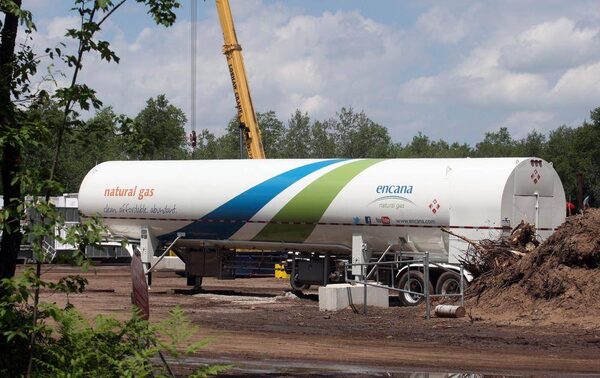 A large EnCana tank is seen on the construction site of a well for oil and natural gas in a State Forest Park in Kalkaska, Mich.REBECCA COOK/Reuters