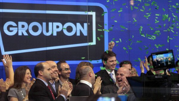 Employees and guests of Groupon ring the opening bell in celebration of the company's IPO at the Nasdaq Market in New York on Nov. 4, 2011.BRENDAN MCDERMID