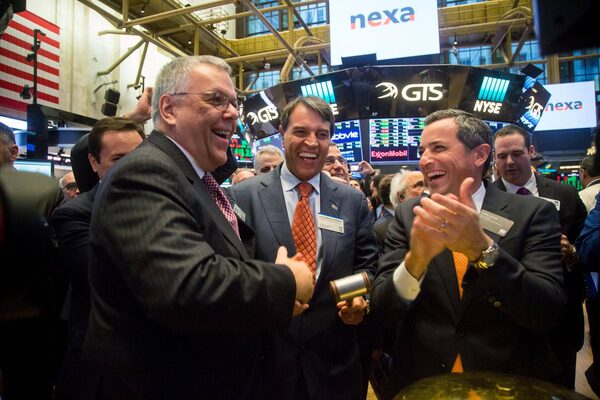 Tito Martins, CEO of Nexa Resources SA, left, shakes hands with Luis Ermirio de Moraes, the company’s chairman, centre, during Nexa’s IPO on the floor of the New York Stock Exchange on Oct. 27, 2017.Michael Nagle/Bloomberg