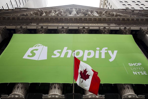 The logo of Shopify hangs behind the Canadian flag after the company's IPO at the New York Stock Exchange May 21, 2015.© Lucas Jackson / Reuters/Reuters