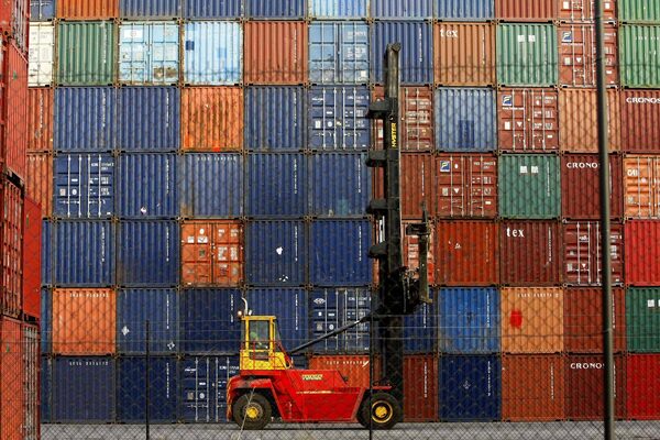 A mast lift truck goes past shipping containers at the Port of Melbourne on June 24, 2008.Mick Tsikas/Reuters