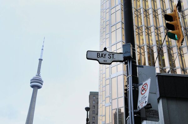 The CN Tower stands in the distance of a Bay Street sign displayed in TorontoBloomberg