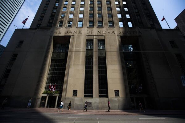 People walk in front of the Bank of Nova Scotia building the financial district in Toronto, Monday June 2, 2014.