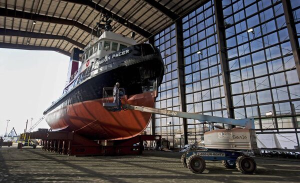 A worker uses a lift while painting the Seaspan Pacer tugboat in North Vancouver, B.C., in 2013.Darryl Dyck/Bloomberg