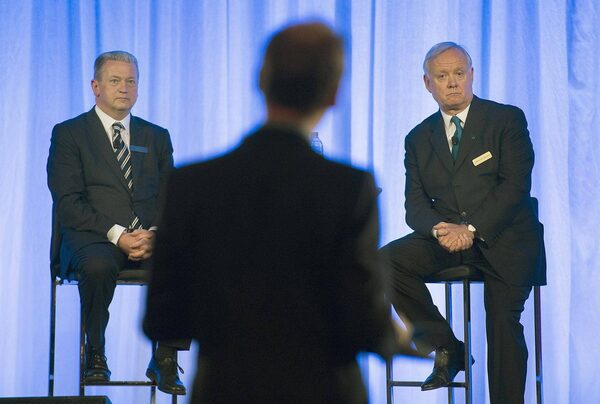 SNC-Lavalin president and CEO Neil Bruce, left, joins chairman Lawrence Stevenson on stage to take questions at the company’s annual general meeting on Thursday in Montreal.Graham Hughes/The Canadian Press