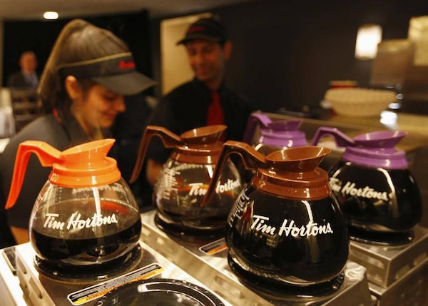 Tim Hortons employees prepare coffee before the company's annual general meeting in Toronto, in this file photo taken May 8, 2014. Burger King Worldwide is in talks to buy Canadian coffee and doughnut chain Tim Horton's, according to the Wall Street Journal, in a deal that would be structured as a tax inversion to move the hamburger chain's domicile out of the United States.Peter Jones/Reuters