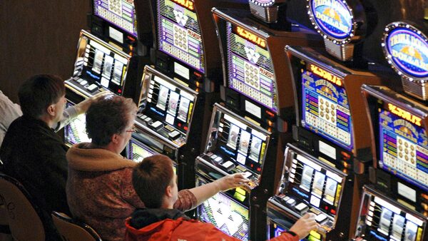Three patrons play slot machines in the Hollywood Casino at Penn\National Race Course in Grantville, Pennsylvania, U.S., on Tuesday, Feb. 12, 2008.BRADLEY C BOWER