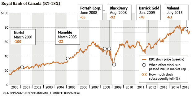 Surpassing RBC on the index only to fall on hard times is not unusual. In fact, it's the norm: Over the past two decades, every stock that has made it to the top – Nortel Networks Inc., Barrick Gold Corp., Potash Corp. of Saskatchewan Inc., BlackBerry Ltd. (formerly Research In Motion Ltd.) and Manulife Financial Corp. – has subsequently fallen by double-digits at best. In the case of Nortel, the shares were wiped out.