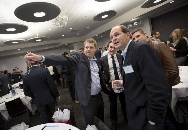 From left: president of Canadian Tire Corp. Michael Medline, Ray Ward, CEO of Oxford Properties Group Blake Hutcheson, and CEO of Freshii Matthew Corrin chat during a charity breakfast in Toronto last month.Darren Calabrese/The Globe and Mail