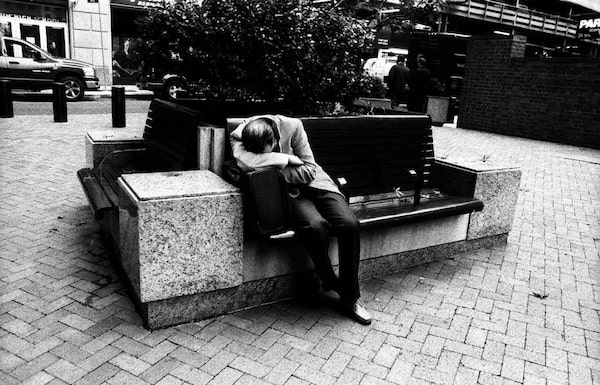 A worker rests his head on his accountant bag on a bench in the financial district in New York. When one of Wall Street’s largest investment banks, Lehman Brothers Holdings Inc., went under, the biggest global financial crisis since the Great Depression was on.Sami Siva/The Globe and Mail