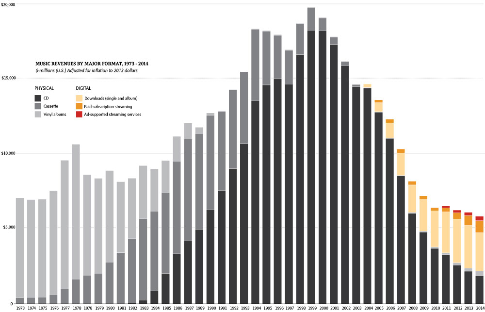 Drinking from this bottomless well is a great thing for consumers, but the flat fee means suppliers – musicians – generally make less money. There’s no limit to the number of albums you can sell, but when everyone streams at at a fixed price, the playing field gets skewed. Ms. Keating has made a-third-of-a-cent per stream on average so far in 2015; 1.5 million streams has yielded less than $5,000.