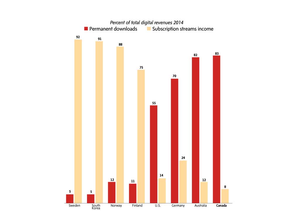 Apple, which has millions of credit card numbers in iTunes ready to convert to streaming with a single click, is poised to boost streaming adoption. Amy Terrill, Music Canada‘s vice-president of public affairs, says it “bodes well for Canada” that Apple is bringing mainstream attention to streaming. It’s one of the last major music markets to embrace the technology, with only 8 per cent of digital revenue in 2014 coming from subscription streams, versus 23 per cent globally, says IFPI data; total music-industry revenue fell 11 per cent here last year.