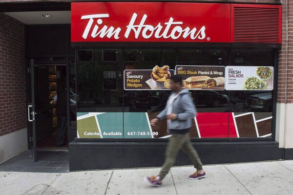 A pedestrian walk past a Tim Hortons coffee shop in downtown Toronto on June 29, 2016.Eduardo Lima/The Canadian Press