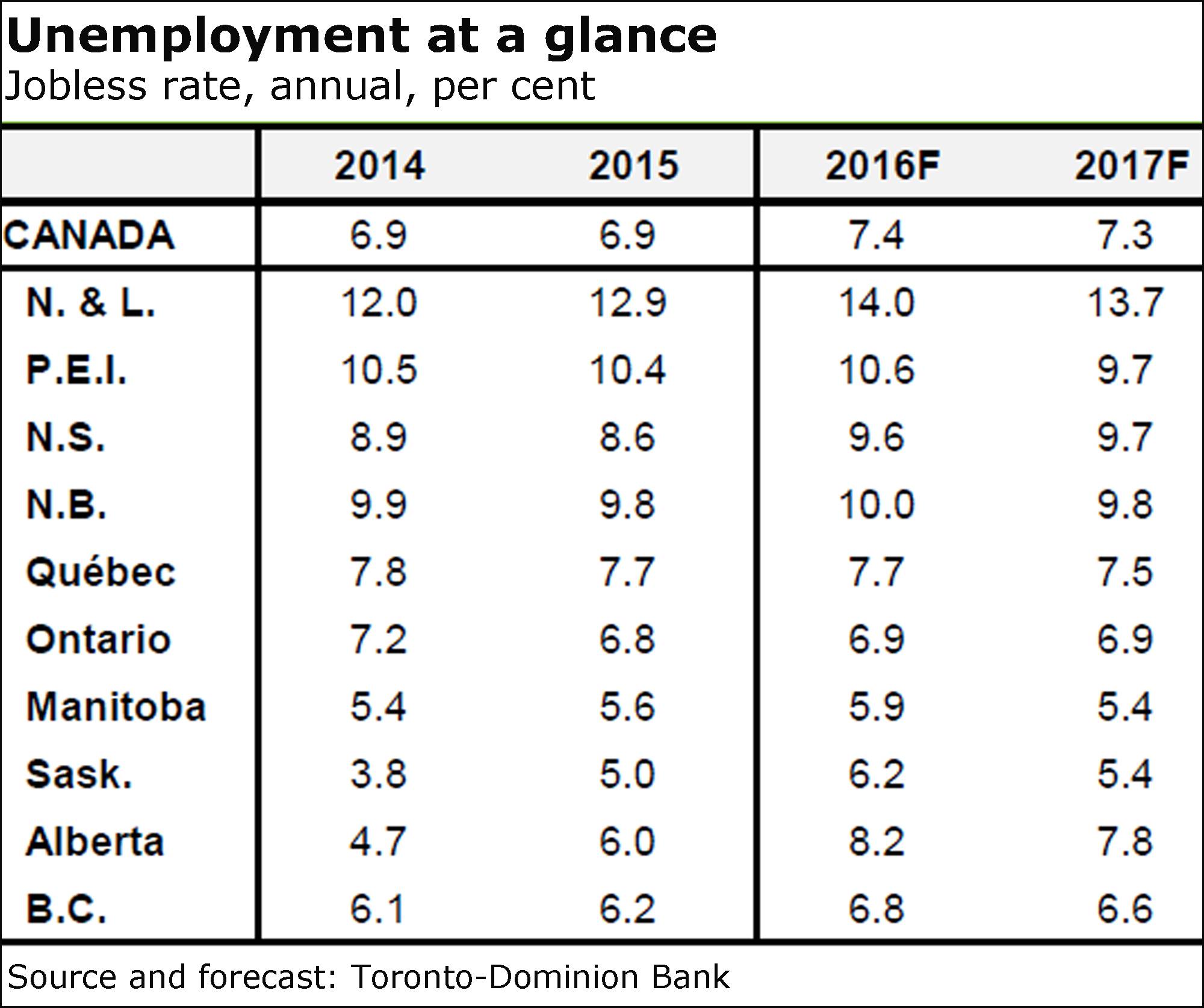 “Increased migration from the weaker to the stronger job markets within Canada should help stabilize provincial joblessness as the year unfolds, but the national rate has likely not yet topped out,” they said, forecasting it will hit 7.5 per cent by mid-2016 before inching down again.