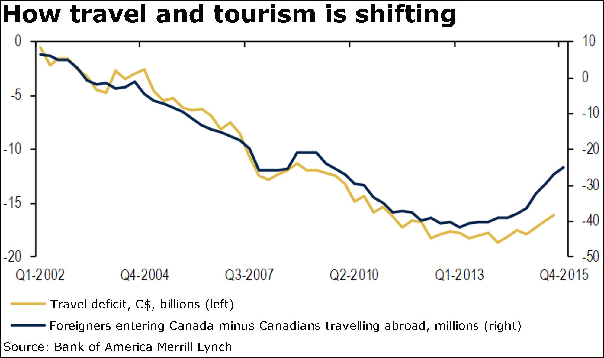The North America economist at Bank of America Merrill Lynch noted in a recent report that the country’s travel deficit, or the amount spent in Canada by foreigners minus the spending of Canadians abroad, was a hefty $18.1-billion in 2014, or about 1 per cent of gross domestic product.