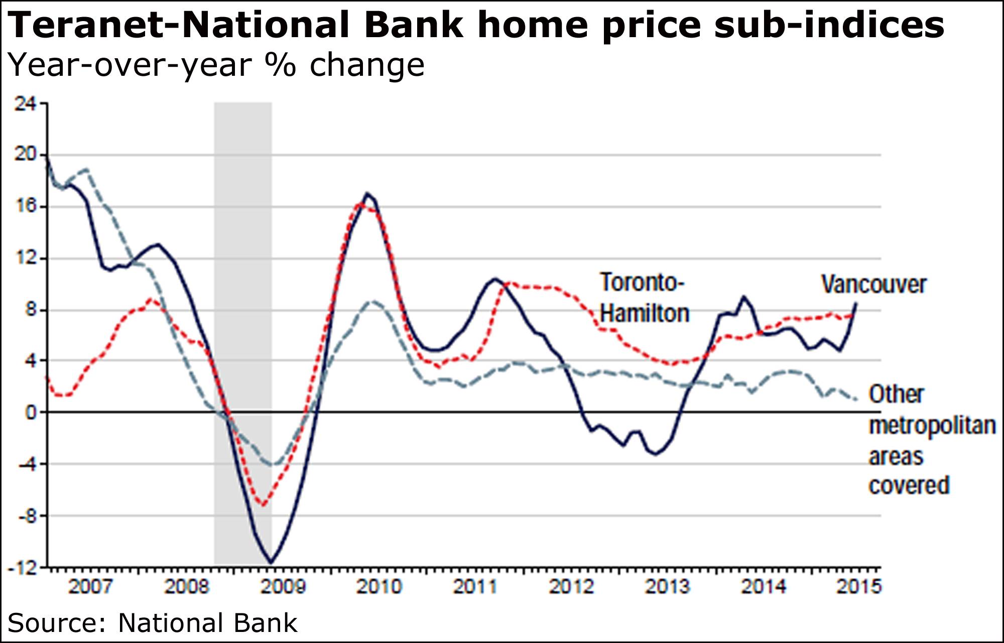 Vancouver and Toronto again led the way, with prices up 8.5 per cent in the former and 7.8 per cent in the latter on an annual basis.