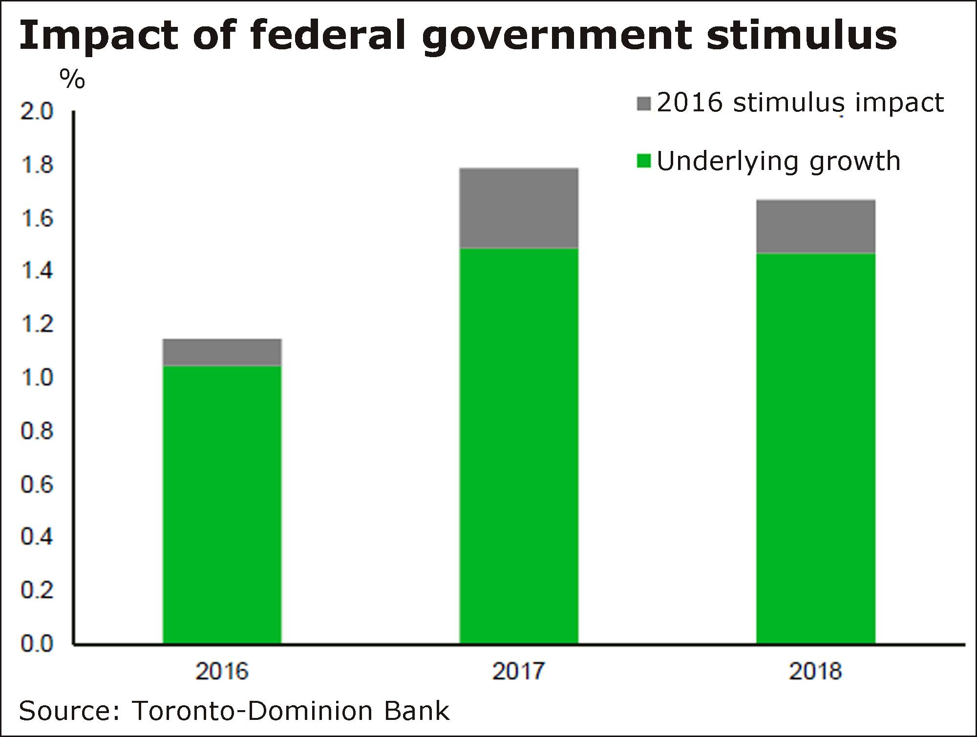 Government stimulus takes time to filter through the economy, and, according to TD chief economist Beata Caranci, the Liberal effort should really make its mark in 2017 and 2018, adding to economic growth by 0.3 and 0.2 of a percentage point, respectively.