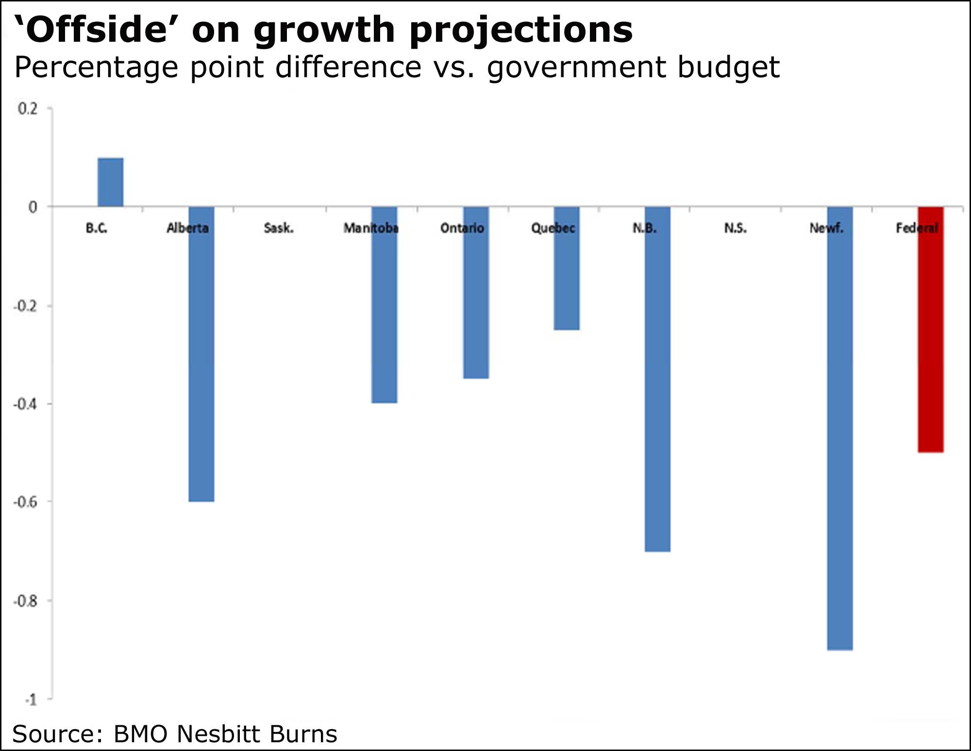 The Canadian government and many of the provinces are already “offside” from the economic growth projections in their budgets, BMO Nesbitt Burns calculates.