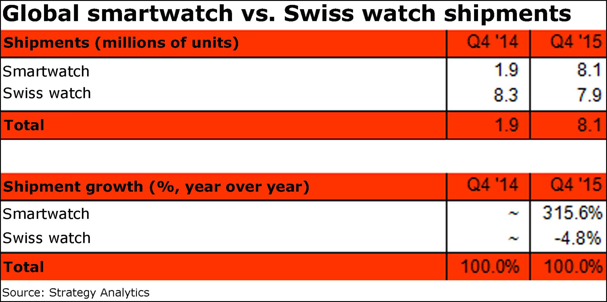 Smartwatches have overtaken Swiss watches for the first time, according to Strategy Analytics, chalking up global shipments of 8.1 million units in the fourth quarter.
