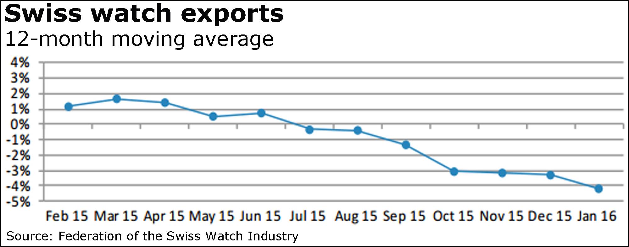 In its latest report, the Swiss industry cited the decline in January exports of 7.9 per cent from a year earlier.