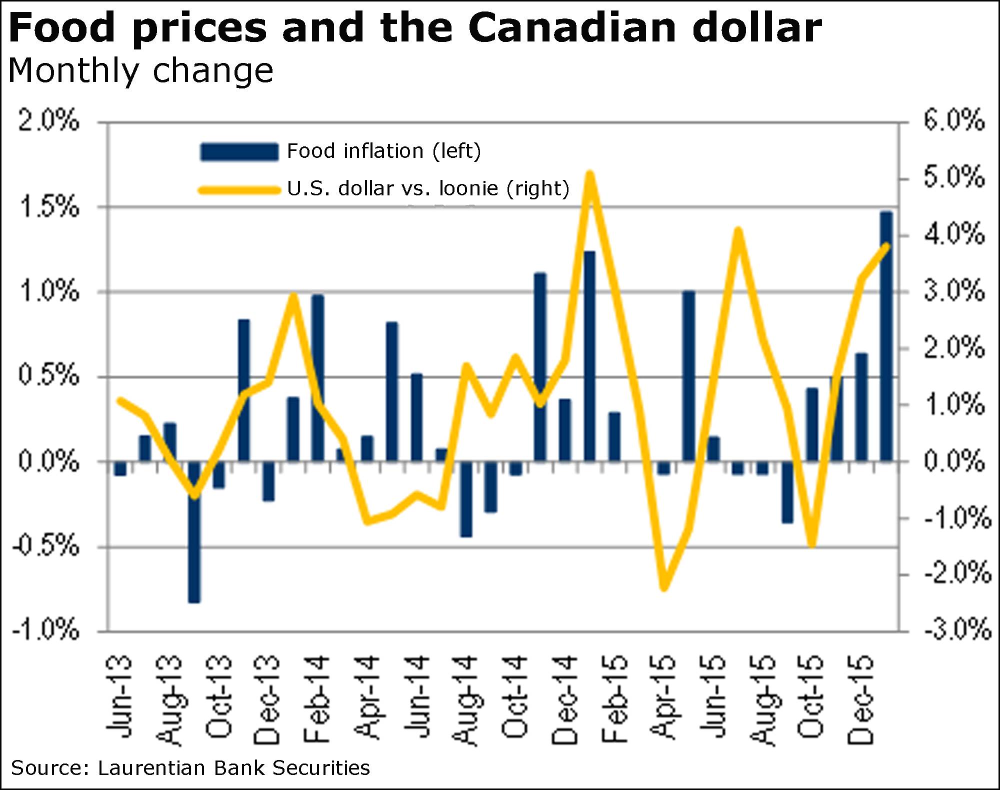 “Prices of fruits and vegetables, imported for the most part at this time of the year, soared for a fourth consecutive month in January, reflecting the 9-per-cent cumulative depreciation observed in the Canadian dollar since October,” said economist Dominique Lapointe of Laurentian Bank Securities.