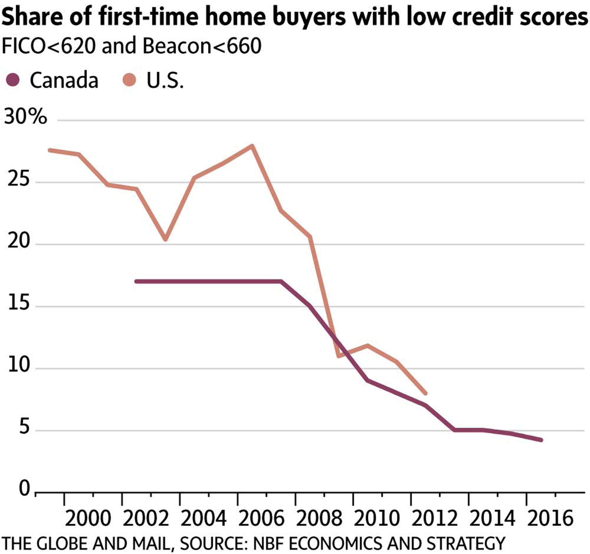 His point, as this chart shows, is that “the share of first-time home buyers with a low credit score on this side of the border recently fell to a multiyear low of 4 per cent.”