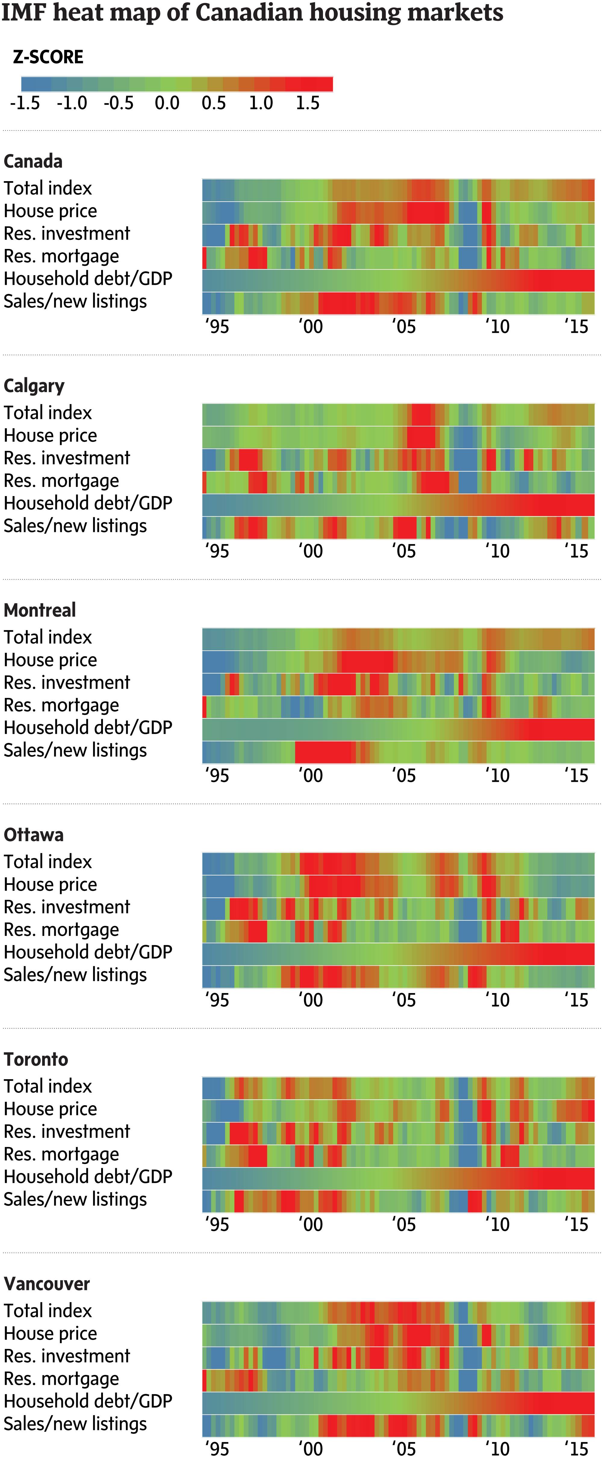 What’s different in the report released by the IMF this week is an interesting heat map that looks at housing markets across Canada, measuring everything from prices to listings.