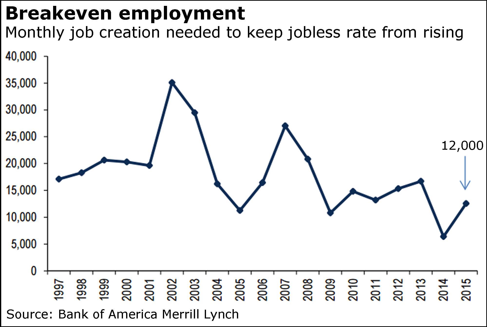 “It’s enough to put downward pressure on slack over time,” Emanuella Enenajor said in a recent report, noting that the “break-even” number, or that needed to keep the unemployment rate in check, was about 12,000 last year.