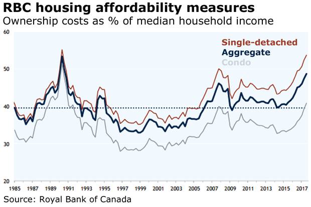 In their latest look, RBC's Mr. Hogue and his colleague Craig Wright, the bank's chief economist, found affordability in Vancouver, Toronto and Victoria at the worst levels ever in the third quarter of 2017, with "tensions rising" in Ottawa and Montreal, though not yet out of hand.