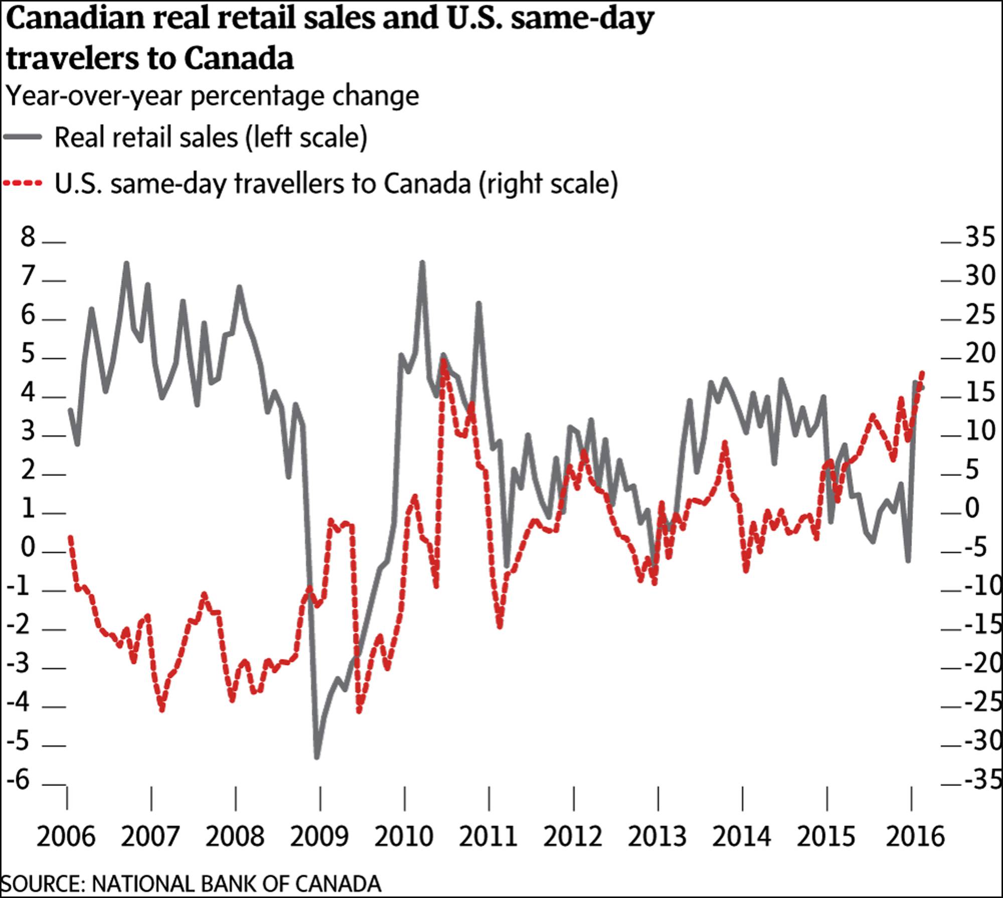 One of the gauges of cross-border shopping are same-day trips, which Mr. Rangasamy’s research shows is now on the rise from the U.S. at the fastest pace in six years.