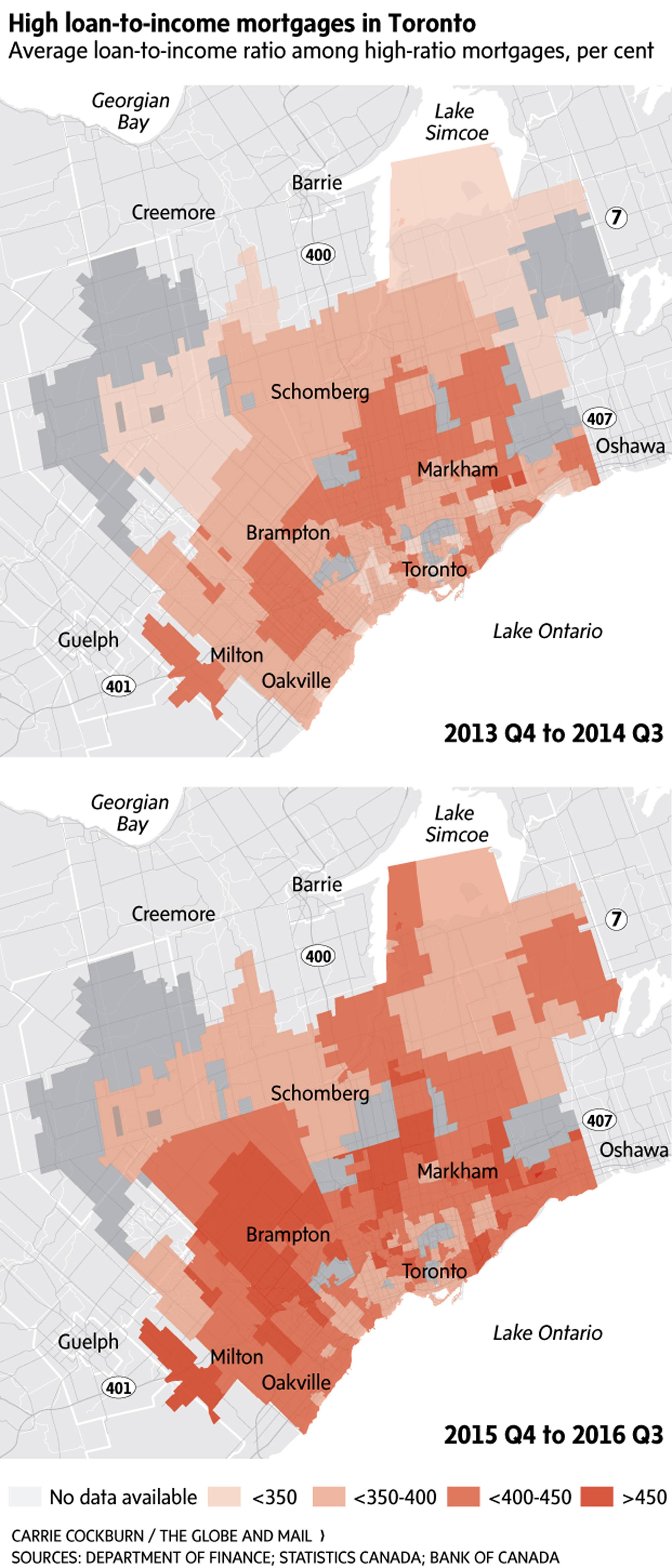 What these maps show is the stunning rise in high-ratio mortgages, notably those with a loan-to-income, or LTI, ratio that tops 450 per cent.