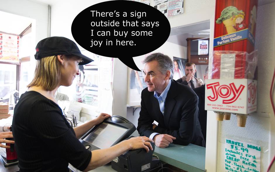 Alberta Premier Jim Prentice chats with owner Mandy Kenworthy through the order window during a campaign stop at Jack's Drive in Spruce Grove after announcing the provincial election on Tuesday, April 7, 2015. Amber Bracken for The Globe and Mail