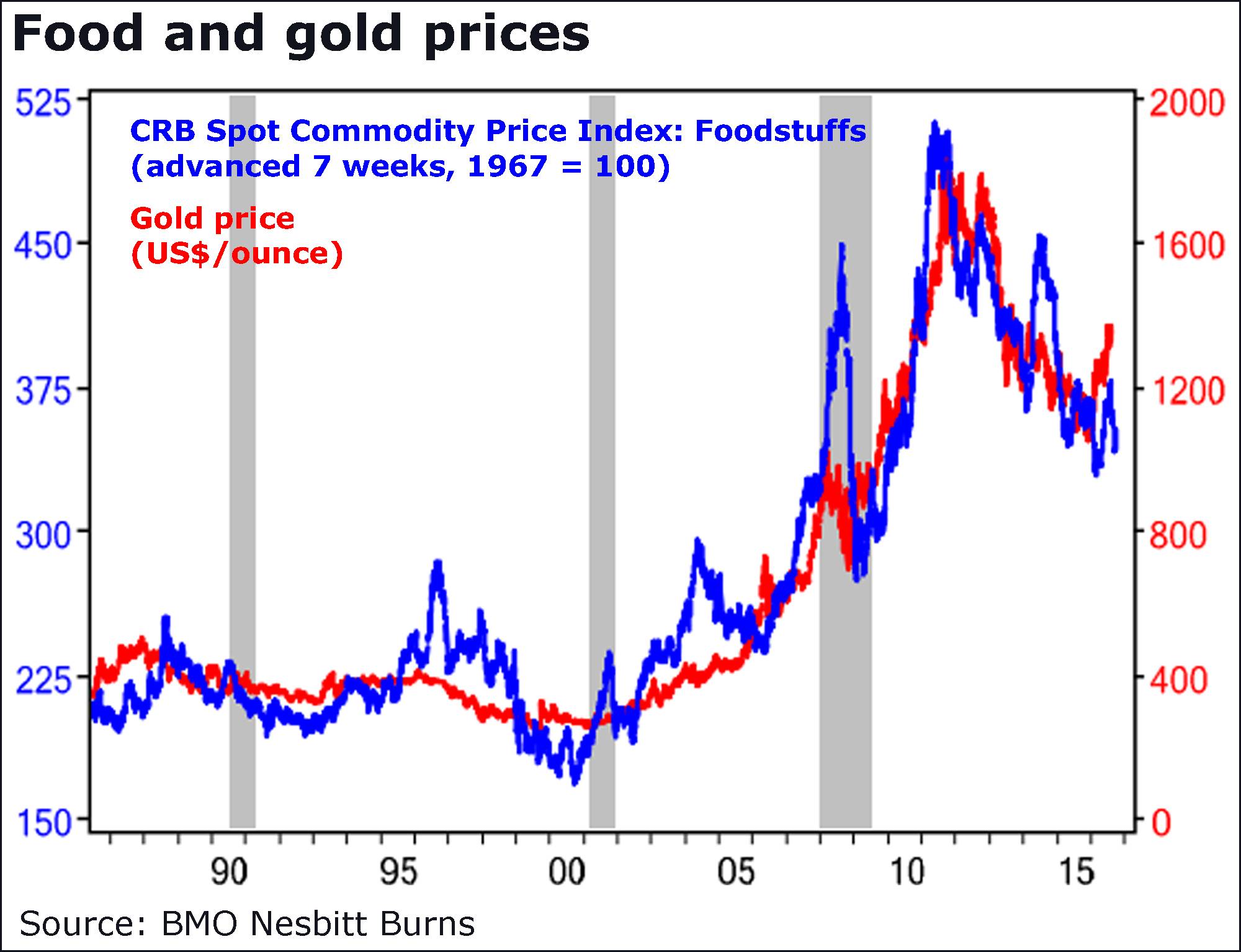 This chart began “as a bit of a lark, pointing out a spurious relationship between gold and food prices,” said Bank of Montreal chief economist Douglas Porter.