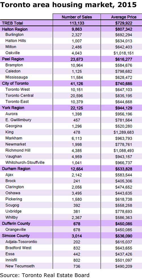 The report from the Toronto Real Estate Board, which takes in a wide area including Durham, Halton, Peel and York regions and Dufferin and Simcoe counties, showed 113,133 home sales last year, up 11.8 per cent from a year earlier.