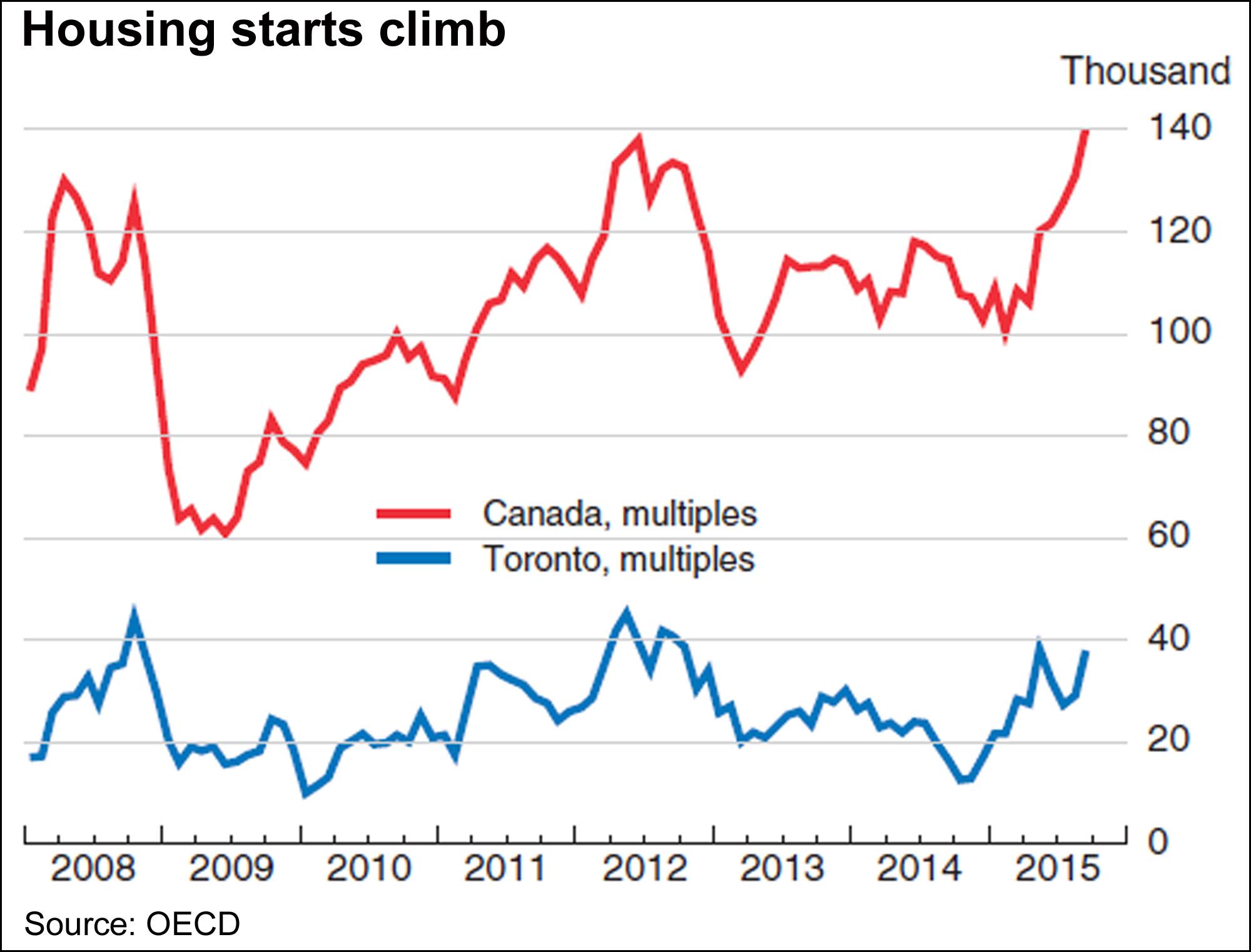 “In Ontario, and especially Toronto, economic activity has been relatively buoyant and demand by foreigners has been boosted by the falling Canadian dollar. That said, newly completed but unoccupied housing units have soared in Toronto, increasing the risk of a sharp market correction.”
