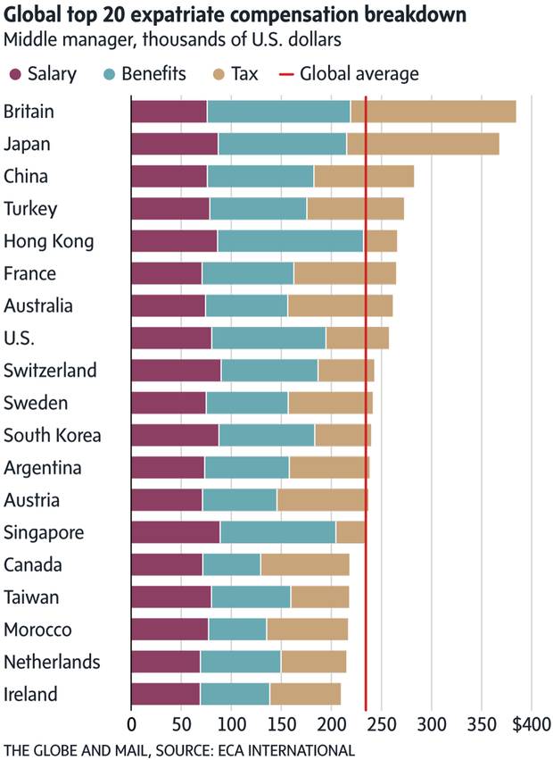 A recent report from ECA International, for example, ranked Canada as No. 15 in terms of expense for expat middle managers, below the average, with the company saying at the time that compensation packages are lower because employers don't need big incentives to attract people here.