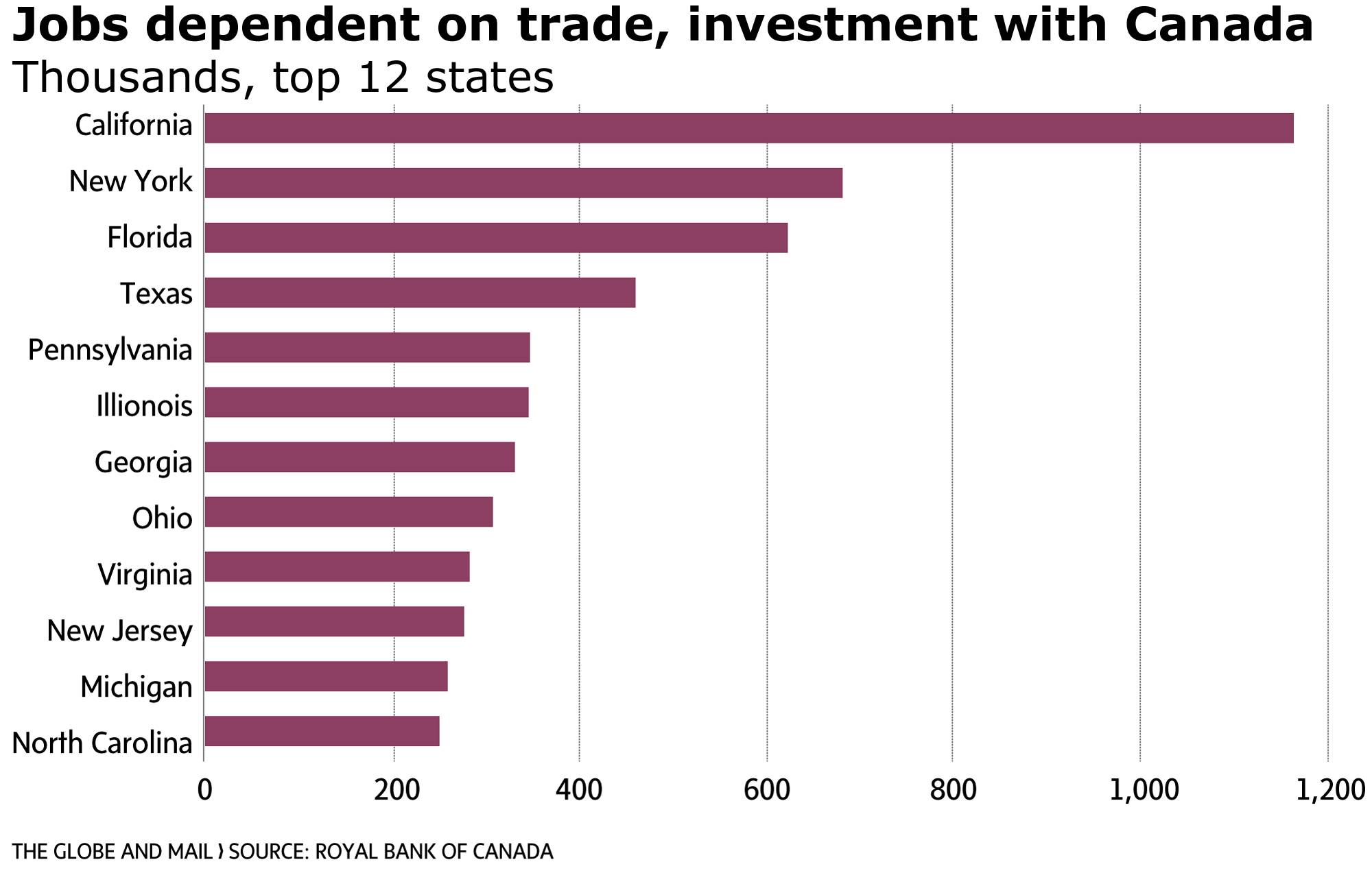 Ms. Cooper’s findings: The jobs of almost 1.2 million Californians are connected to Canadian trade and investment. In New York, 680,000. And in Florida, 620,000.