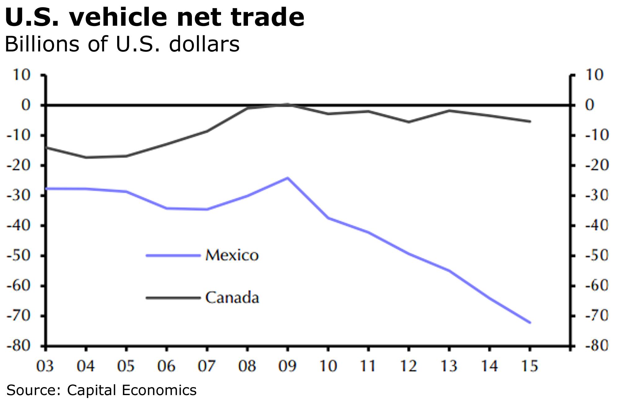 The U.S. vehicle deficit with Mexico is more than double what it was five years ago, Mr. Ashworth noted, but almost unchanged where Canada is concerned.