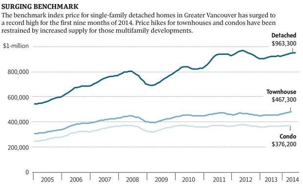 On the rise: Prices have climbed sharply for Greater Vancouver's single-family detached homes
