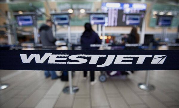 Westjet Airlines Ltd. signage is displayed on a band as travellers stand in line at Vancouver International Airport in this file photo.Ben Nelms/Bloomberg