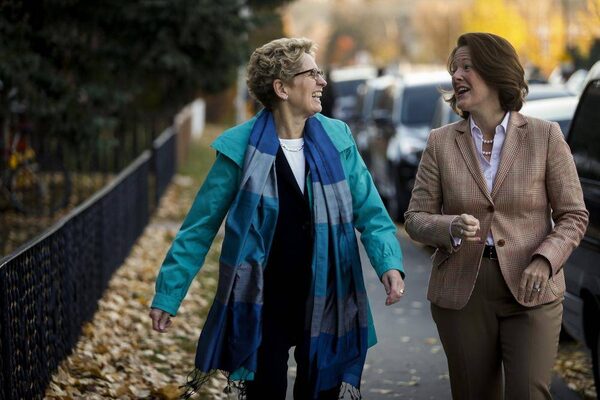 Ontario Premier Kathleen Wynne, left, walks with Alberta Premier Alison Redford to a popular coffee shop in Calgary, Alta., Friday, Oct. 25, 2013.Jeff McIntosh/The Canadian Press