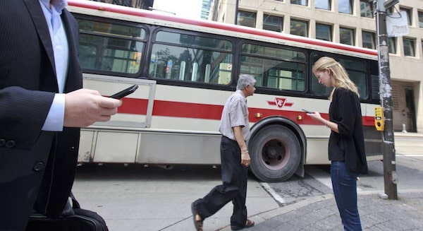 Cellphone users cross Bay street in Toronto's financial district.Gloria Nieto/The Globe and Mail