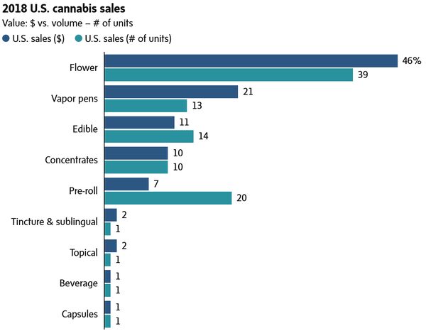 First up, here is a snapshot of U.S. cannabis sales in 2018 (all charts below are from the Deloitte study):