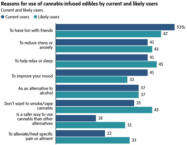 Deloitte’s survey suggests that both current (53 per cent) and likely consumers of edibles see the products as something to be consumed socially among a small group of friends, and nearly half of likely buyers say they’d prefer to consume at home: