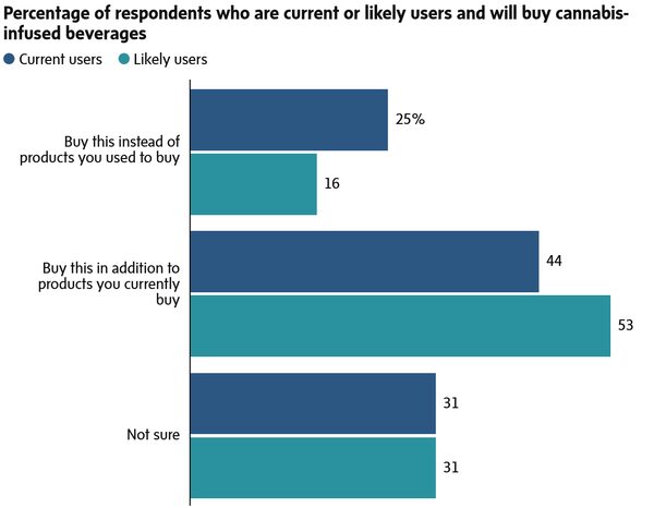 The survey says about one in three (35 per cent) of likely cannabis consumers “see cannabis-infused beverages as an alternative to alcohol – perhaps seeing cannabis beverages as a way to relax, sleep, alleviate stress or anxiety, lift their mood and have fun with friends without the risk of a hangover the next day.”